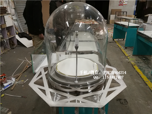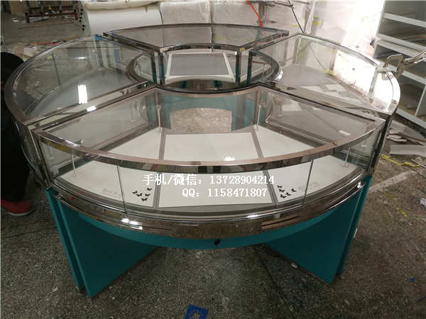 圓形中島展示柜直徑為1米8,由4套獨立的扇形玻璃展示柜組合而成。